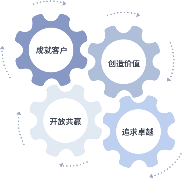 成就客户是一切决策的出发点,,,,创造价值是衡量所有工作的标准,,追求卓越是我们做事做人的态度,,,开放共赢是我们的格局也是最终的结果。。。价值观的齿轮环环相扣,,,,推动着组织里的每个人不断向前。。。。